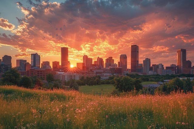 Denver colorado skyline at sunset shining through dramatic clouds over a field of flowers